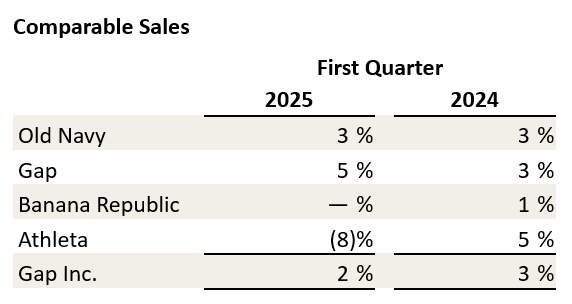 - First quarter net sales of $724 million were up 5% compared to last year. Comparable sales were up 5%. Gap continued to execute the brand reinvigoration playbook with clarity and consistency, achieving positive comparable sales for the 6th consecutive quarter and market share gains for the 8th consecutive quarter. The brand is resonating with customers and gaining relevance.