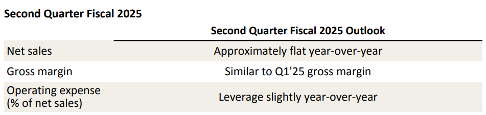 The below fiscal 2025 outlook does not reflect the potential effect of tariffs, which are currently 30% on most imports from China and 10% on most imports from other countries. If these tariff rates remain, they could result in a gross estimated incremental cost of approximately $250 million to $300 million. The company currently has strategies to mitigate more than half of that amount. After considering these mitigation strategies, the company estimates a remaining net impact of about $100 million to $150 million to fiscal 2025 operating income, primarily weighted to the back half of the year. There is minimal impact expected to the second quarter fiscal 2025 gross margin outlook below.
