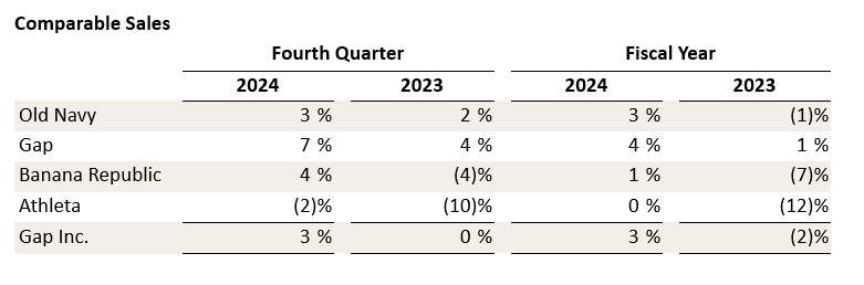 • Fourth quarter net sales of $2.2 billion were down 3% compared to last year. Comparable sales were up 3%. The brand continues to win in key categories, like active and denim, with innovation and newness driving strength and market share gains.